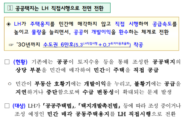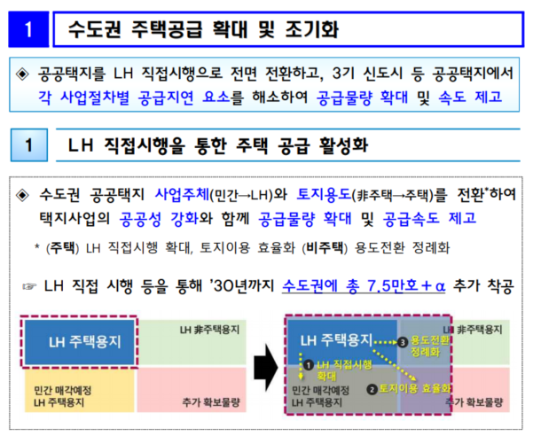 수도권 공급 정책은 공공택지에서의 주택건설을 LH(한국토지주택공사) 직접 시행으로 전면 전환하고, 3기 신도시 등 공공택지에서 각 사업절차별 공급 지연 요소를 해소해 공급물량을 확대하고 속도를 끌어올리는 데 초점을 맞췄습니다.