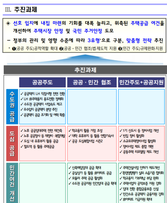 정부는 주택 공급 확대를 위한 전략을 크게 3가지 측면으로 나눠서 추진할 방침인데요. △수도권 주택공급 화대 및 조기화 △도심내 주택공급 확대 △재개발·재건축 등 정비사업 활성화, 이렇게 3개 세부 전략을 바탕으로 공급계획을 추진해 나갈 예정입니다.