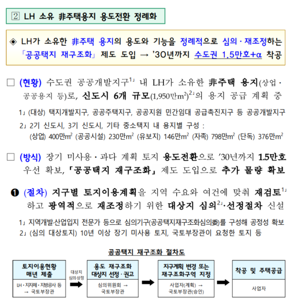 또한 공공택지 중에서 비주택 용도 부지를 주택용지로 전환하는 ‘토지이용 효율화’를 통해서도 주택 공급을 늘릴 계획이고요.
