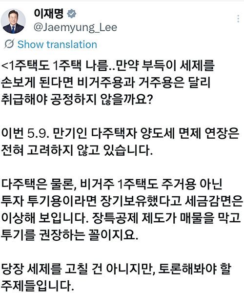 우선 지난 1월 23일에는 공식 엑스(X·옛 트위터) 계정을 통해 “이번 5월 9일이 만기인 다주택자 양도세 면제 연장은 전혀 고려하지 않고 있다”고 밝혔습니다.