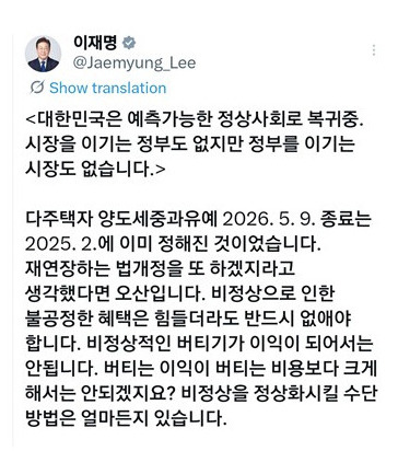 “단, 지난 4년간 유예 반복을 믿게 한 정부 잘못도 있으니 2026년 5월 9일까지 계약한 것은 중과세 유예를 해 주도록 국무회의에서 의논해 보겠습니다”