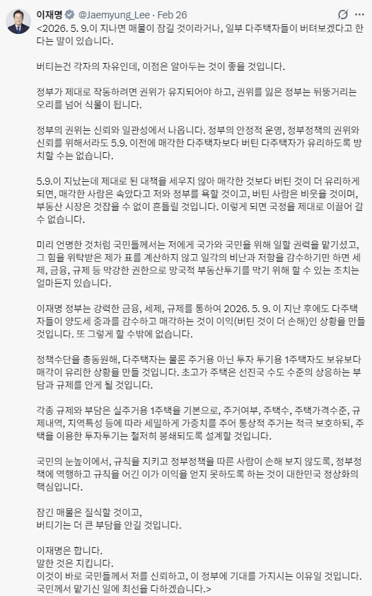 “이재명 정부는 강력한 금융, 세제, 규제를 통하여 2026년 5월 9일이 지난 후에도 다주택자들이 양도세 중과를 감수하고 매각하는 것이 이익(버틴 것이 더 손해)인 상황을 만들 것입니다. 또 그렇게 할 수밖에 없습니다”