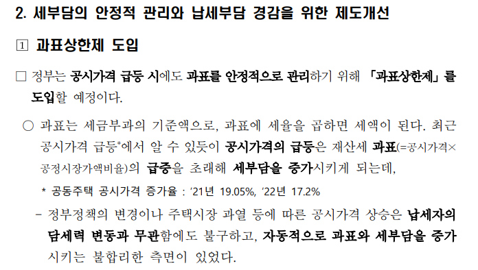 행정안전부 관계자는 “과표상한제가 도입되면 최근과 같은 공시가격 급등 상황 속에서도 재산세 부담이 안정적으로 관리될 수 있다”고 제도의 도입 취지를 설명하고 있습니다.