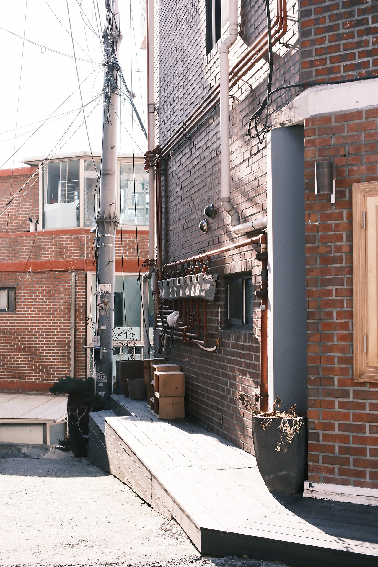 가스관이 건물 외벽을 타고 질서정연하게 기어오르는 모습이 참 신기하지 않나요. 벽을 따라 이리저리 굽이치는 이런저런 관들과 연통을 구경하면 작은 건물 한 채를 짓는다고 해도 정말 많은 요소들이 필요하다는 걸 알게 됩니다.