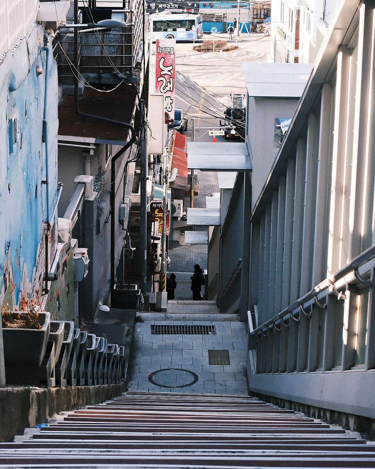 지금은 편의를 위해 계단 한가운데에 경사형 엘리베이터가 설치되어 있습니다. 분명 계단을 내려다보는 그 느낌을 해치게 된 것은 사실입니다. 하지만 한편으로 한겨울에 눈이 쌓였을 때 이 계단을 오르내려야 한다고 생각해 보면 정말 아찔합니다. 중간층 몇 군데에서는 옆으로 빠지는 조그마한 샛길로 내릴 수도 있습니다. 이런 시설이 있어 다행이라고 생각합니다. 이날 눈은 오지 않았지만 한겨울의 칼바람이 언덕을 따라 불어오는데 훈훈한 엘리베이터를 타니 마음도 같이 녹는 느낌이었달까요.