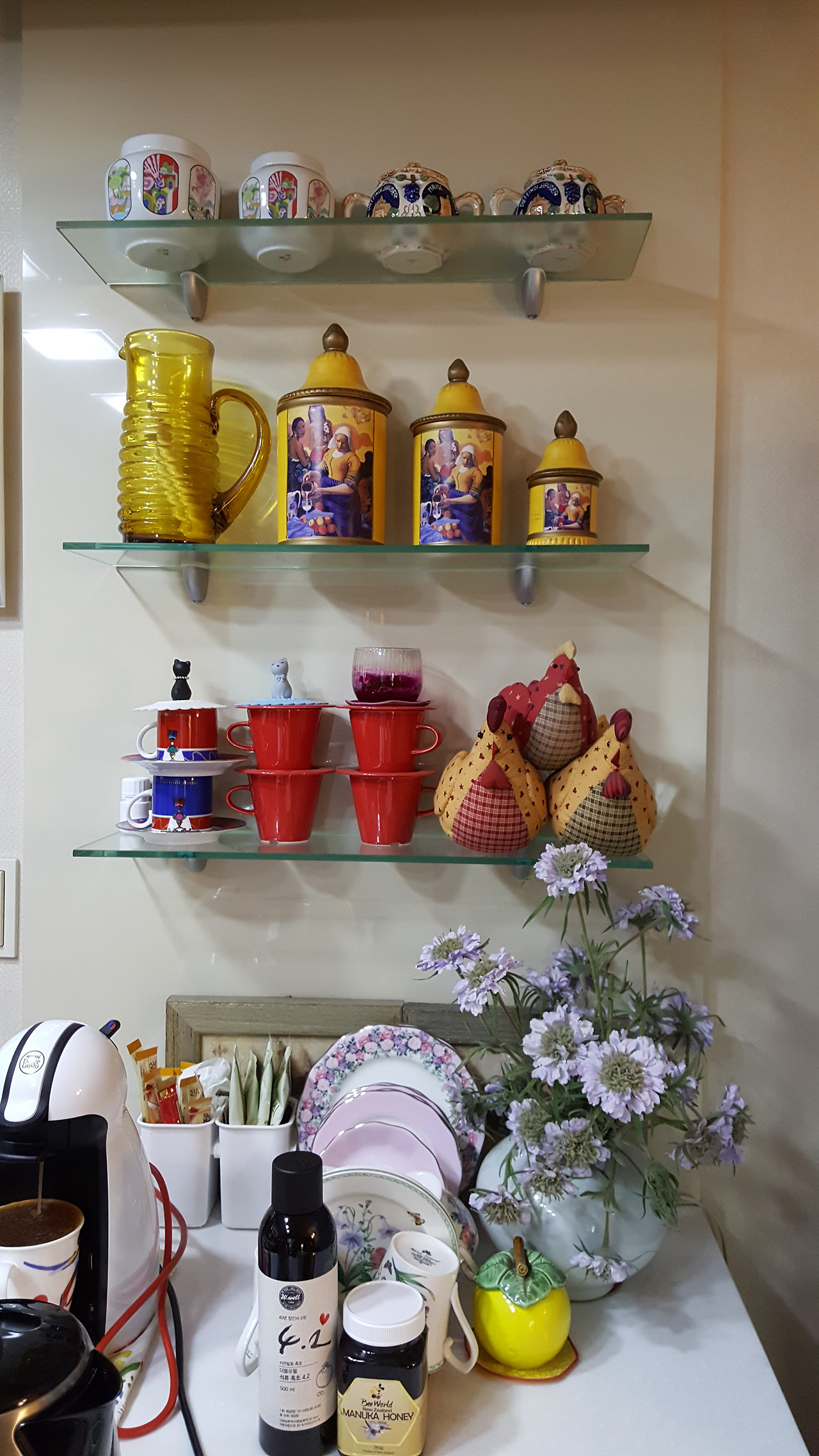 정유년이라고 닭 세 마리가 주방 구석에 자리 잡은 것이 앙증맞았다.
