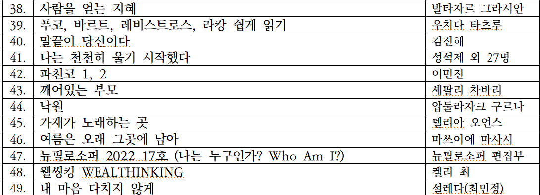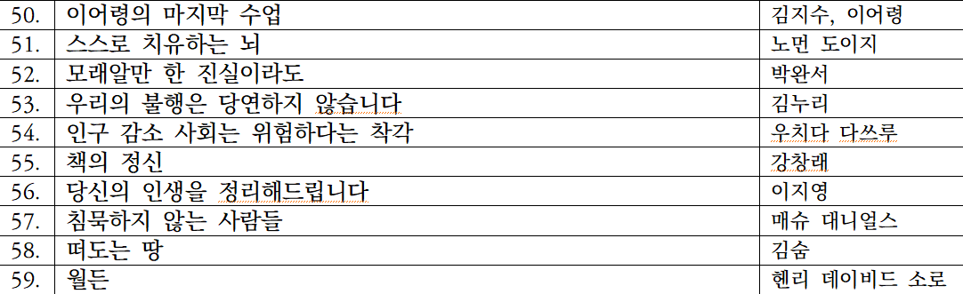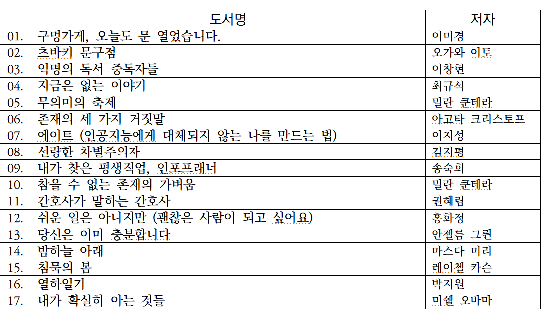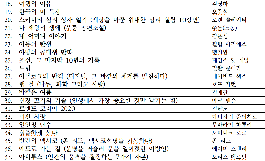 낯선 곳에의 이주와 함께 시작된 책모임이 벌써 5년이 되었고...이제 2차로 우리가 읽은 책들의 목록을 공유합니다. 이런 책들은 감동은 물론 미래에 대한 염려, 세상에 대한 새로운 인식, 도저히 상상할 수 없는 작가들의 세계들을 탐방하게 하였으며 책을 읽는 다는 것은 결국