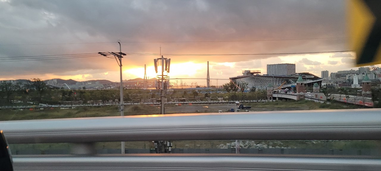정은의 차를 타고 부산항으로 출발~. 밖은 아직도 어두운 미명이다. 가을의 으스스함이 느껴지는 새벽길을 달려 어느덧 저 멀리 부산항이 보이기 시작할 무렵 동쪽 하늘이 붉게 타오른다. 비가 올 것이라는 기상예보와는 달리 화창한 날씨이길.