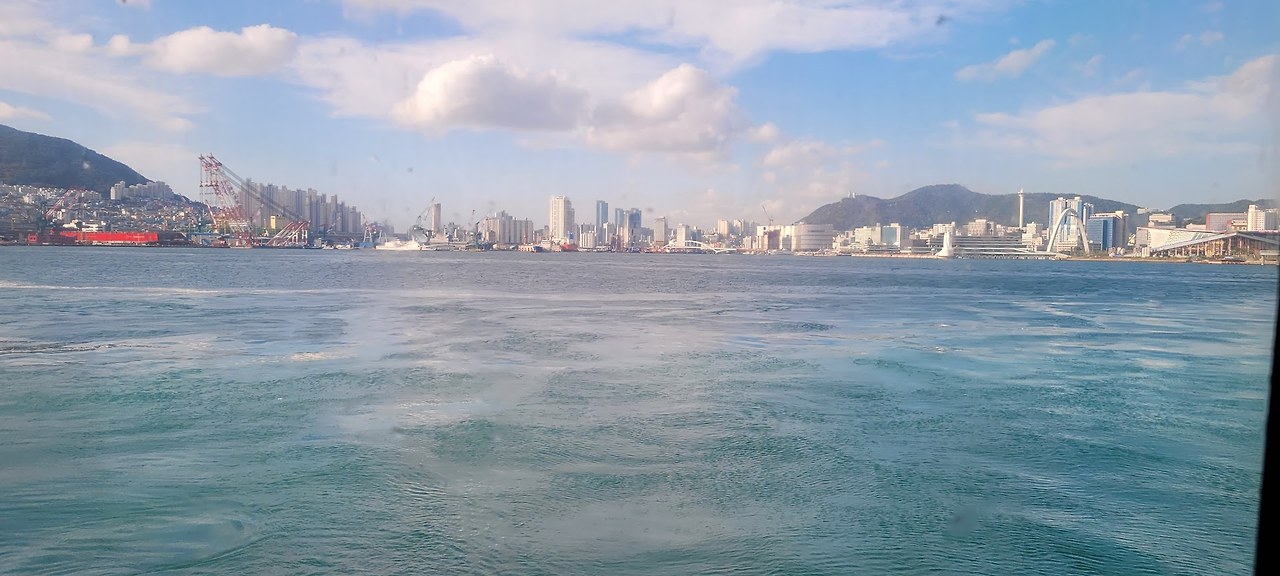 이제 배는 서서히 바닷물을 가르며 부산항에서 멀어진다. 항구를 벗어난 배는 영도섬을 지나쳐 간다.