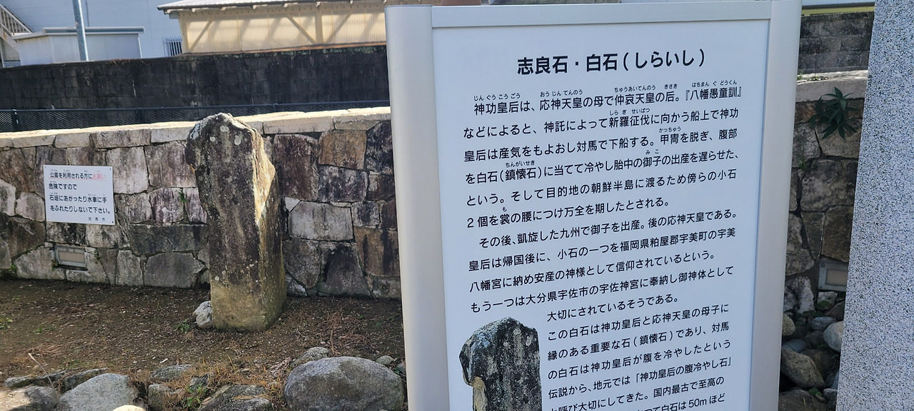 글을 요약하자면 이 '시라이시'(흰돌)는 신공왕후가 임신 중 출산을 미루기 위해 배에 댔다는 출산의 돌이다.