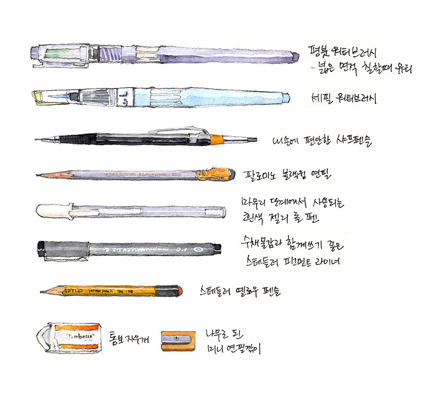 여러 자루의 연필과 펜, 샤프펜슬, 그리고 몸통 부분에 물을 담을 수 있어 별도의 물통 없이도 수채화를 가능케 하는 워터브러시(물붓)는 내게 꼭 필요한 도구이다.