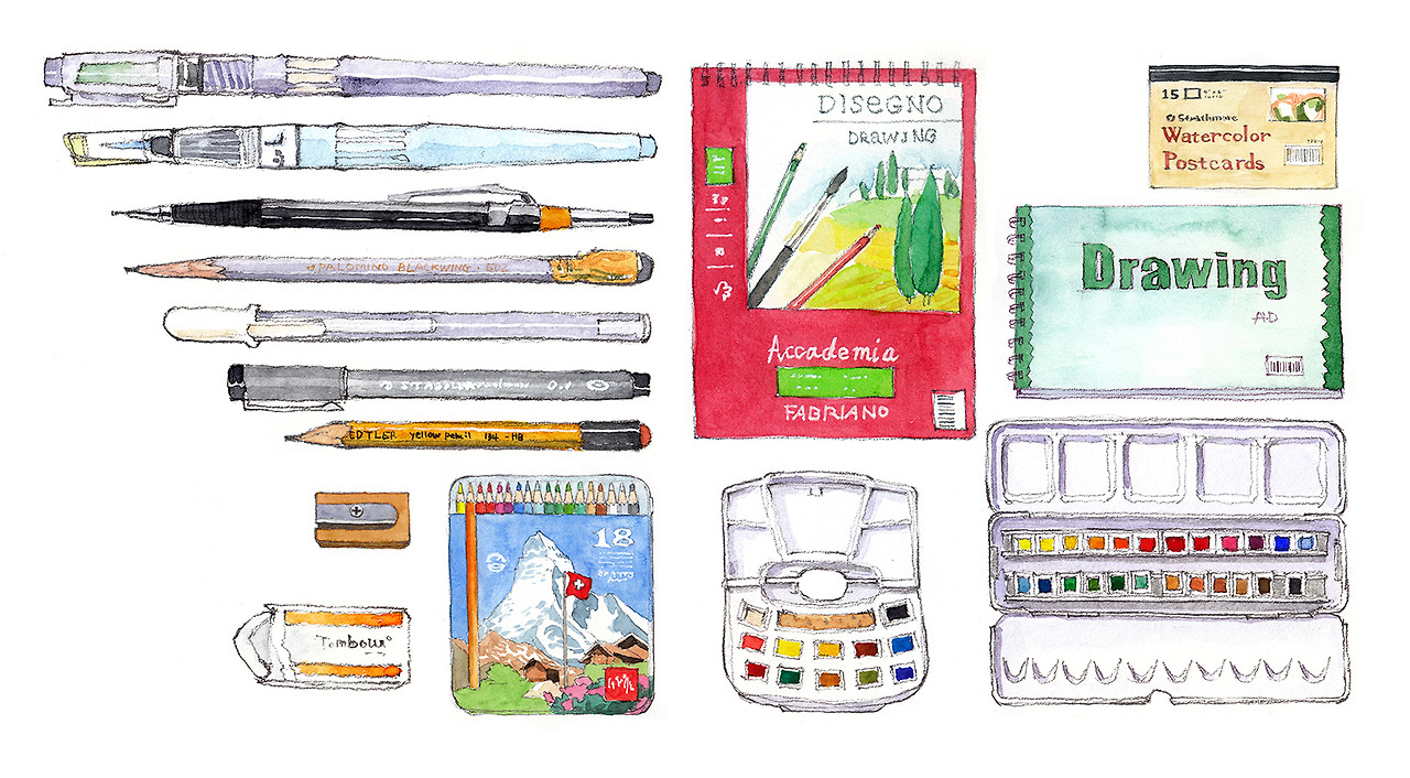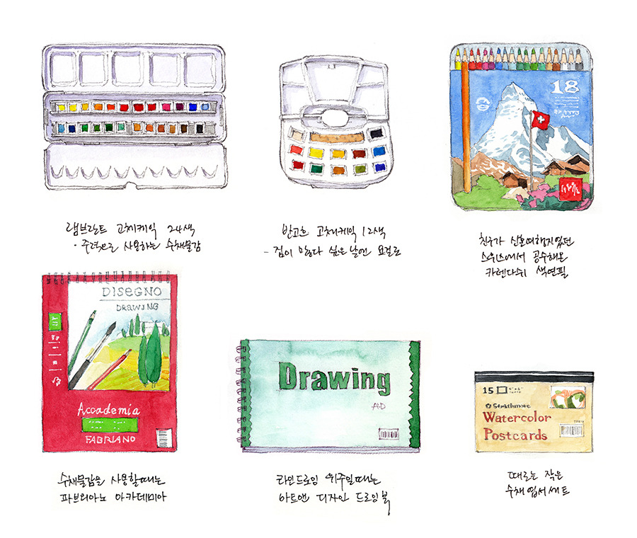 나열해 놓은 준비물들 가운데 고체케익 세트와 드로잉북은 상황에 따라 하나씩만 챙겨 가방에 넣곤 한다. 모든 도구를 가방에 넣어도 책 한 두 권의 무게에 지나지 않으니 짐이 많아질 것이 두려워 그림 여행이 내키지 않는다는 핑계는 이제 과거의 것이 되어버렸다.