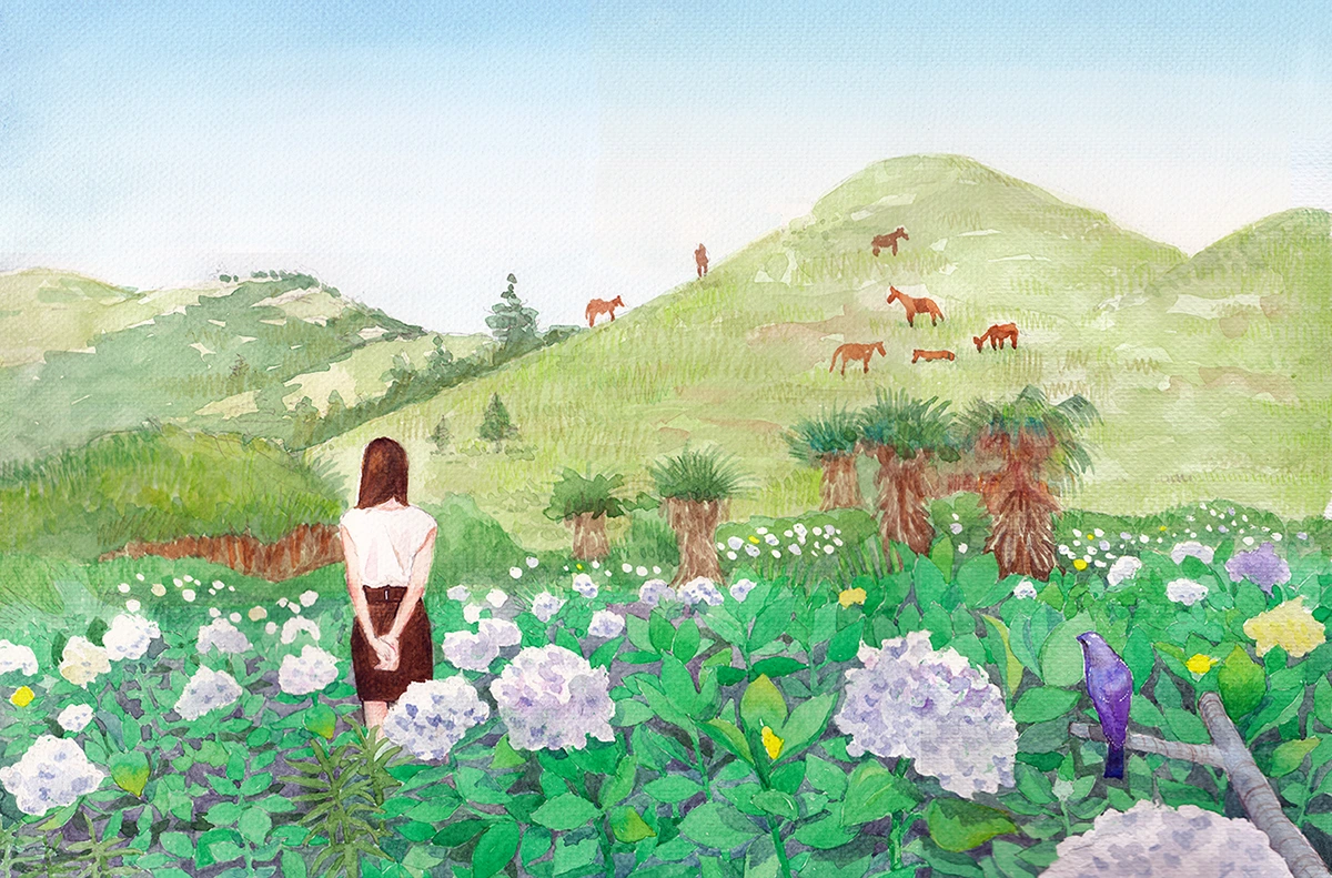 연보랏빛 수국이 지천에 흐드러지듯 피어있고, 그 뒤로 방목중인 말들이 한가롭게 풀을 뜯고 있는 풍경. 숨막힐듯 감미로운 모습 앞에서 내가 할 수 있는 일이라곤 저릿한 가슴을 진정시키며, 눈 앞에 펼쳐진 그 풍경을 마음에 차곡차곡 담는 것 뿐이었다.