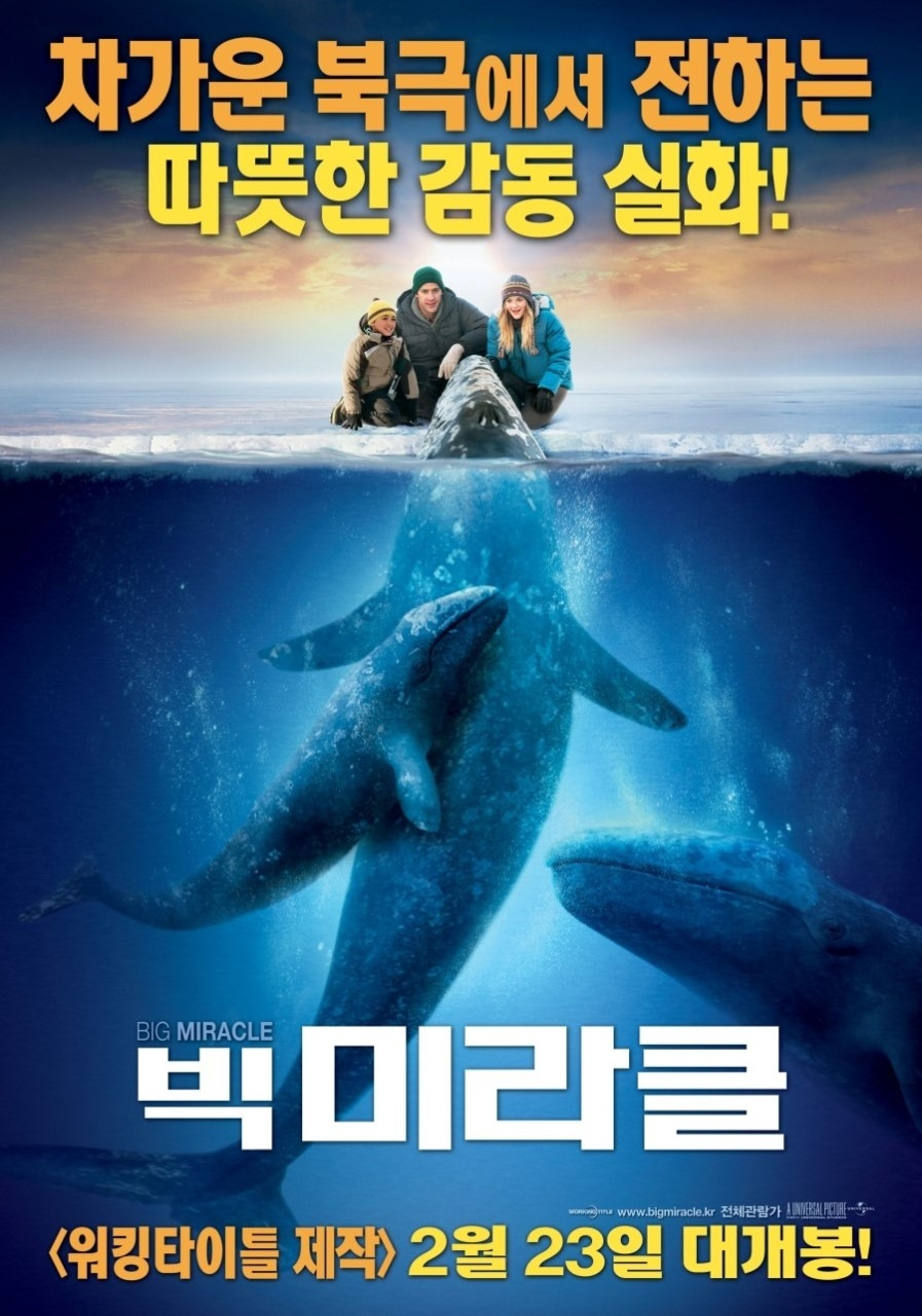 위기에 빠진 동물을 사람들이 구출해 내는 이야기는 많지만, <빅 미라클>은 거의 실화에 가깝다는 점에서 그만큼 생생한 긴장감을 줄 뿐 아니라, 생각해볼 점도 많은 영화입니다. 영화에 나오는 회색 고래(Gray Whale)는 여름이면 북극에서 다양하고 풍족한 먹이를 잡아먹고 지내다가 겨울이 되면 멕시코 바하까지 내려와 따뜻한 겨울을 보낸다고 합니다. 그런데 가끔 너무 멀리 가거나 시기를 놓쳐 북극에 얼음이 얼기 시작하면 빙하 한가운데 갇혀 남하하지 못하는 일이 종종 벌어진다고 하네요.