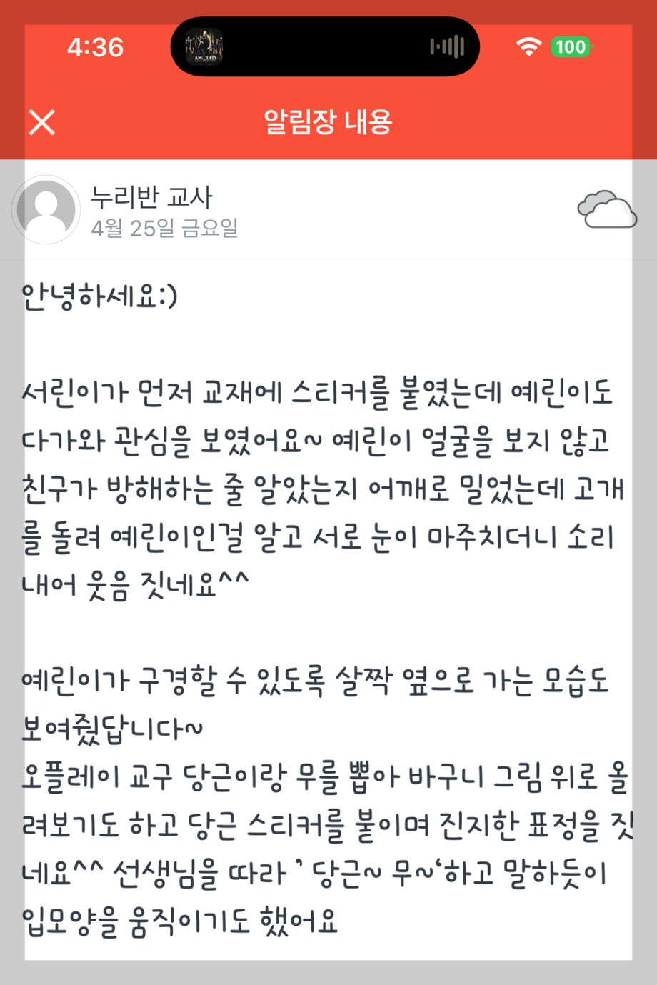오늘도 어김없이 키즈노트가 반가운 소식을 전해줬어요.