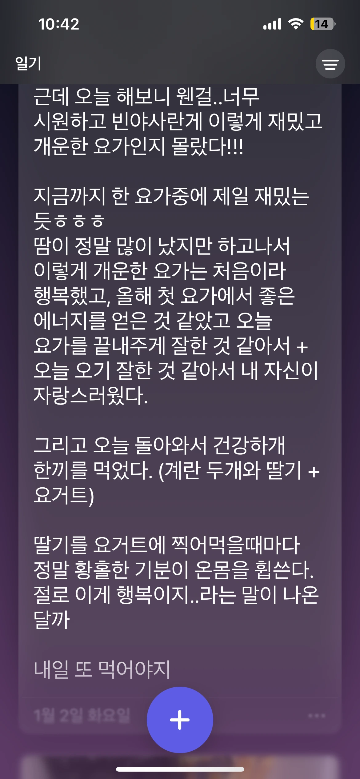 요가도 요가지만 저 날 딸기를 요거트에 찍어먹었는데 진짜……한동안 딸기 + 요거트 조합에 미쳤을정도로 너무 맛있게 먹었었다. 다시 읽으니까 또 그 기분이 생생한데 이 맛에 일기를 쓰는 것 같다.