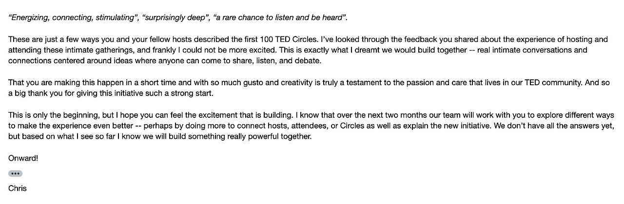 어느 날 아침, 눈을 뜨고 일어나 습관처럼 이메일을 열어보니 TED의 수장인 크리스 앤더슨이 보낸 이메일이 도착해 있었다. 제목은 'Thanks for the strong start, TED Circles', 즉 TED Circles를 멋지게 시작해주어 고맙다는 말이겠지. 아마도 나와 같은 TED Circles 참가자나 호스트들에게 보내지 않았을까 싶다. 그래, 나에게 개인적으로 보낼리가 없지