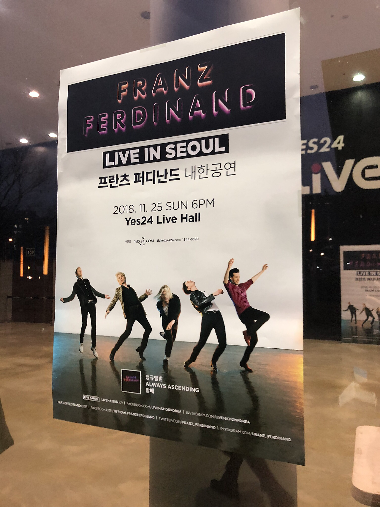 11월 25일 예스 24 라이브 홀을 향하는 도중 들은 예언은 놀랍도록 정확했다. 세 번째 내한 공연을 가진 스코틀랜드 글래스고 출신 프란츠 퍼디난드(Franz Ferdinand)는 일요일 저녁을 가득 채운 ‘새천년의 로큰 롤러’들에게 녹슬지 않은 개러지 댄스 록의 리듬 폭격을 가했다. 선택지는 세 가지뿐이었다. 춤추거나, 미친 듯 점프하거나, 그리고 소리 지르거나.