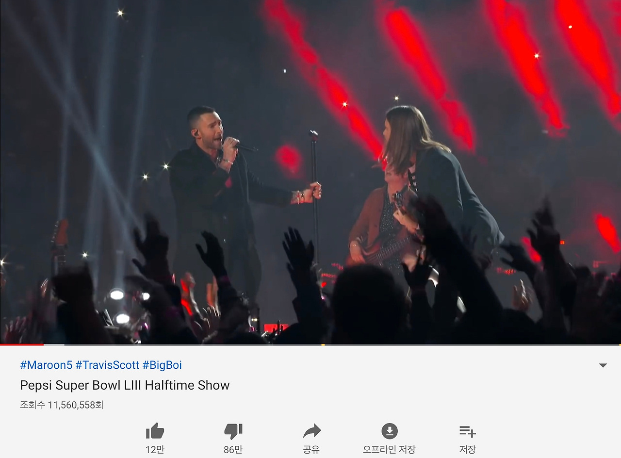 슈퍼볼 하프타임 쇼로 성공하고 부활한 아티스트는 많지만 몰락한 아티스트는 마룬 파이브가 처음이다. 현지 시각 2월 3일 공연이 끝나자마자 엄청난 비판과 조롱이 쏟아졌음은 물론 2주가 지난 지금까지도 그 후폭풍이 거세다. 마룬 파이브의 슈퍼볼 하프타임 쇼 영상의 유튜브 ‘싫어요’ 수는 86만으로, 2주 만에 유튜브 역사상 47번째로 많은 ‘싫어요’를 확보(?) 했으며 미국 미식축구리그(NFL) 계정의 최다 ‘싫어요’ 영상이 됐다.