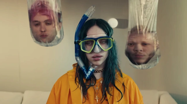 ‘유리를 밟고 / 스테이플러로 혀를 찍어’라 노래하는 ‘bury a friend’를 예로 들어보자. 무의식 속 섬뜩한 분위기를 위해 피네스와 빌리는 일상 속 치과 드릴과 오븐 알람 소리를 활용했으며, 이는 초자연적인 현상을 연기하며 광기의 몸짓을 선보이는 뮤직비디오를 통해 구체화됐다. ‘you should see me in a crown’에선 얼굴 위 거미를 풀어놓으며, ‘bad guy’에선 배 나온 남자들, 목 잘린 채 금붕어처럼 봉투 안에서 뻐끔거리는 남자들을 보여주며 종국엔 남자 위에 올라타 팔 굽혀 펴기를 시킨다.