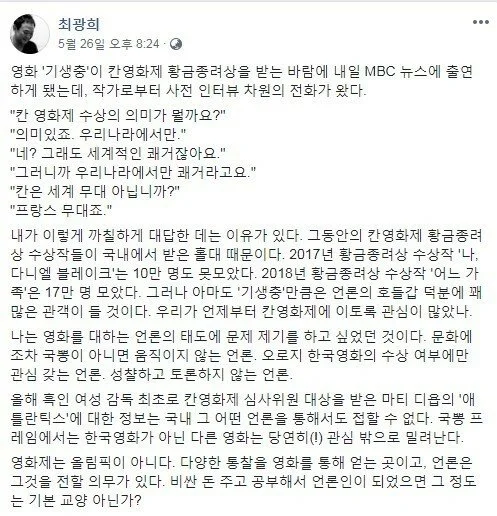 이런 이동진을 ‘CJ cgv의 전속 평론가’라 비판하는 평론가가 있으니 바로 최광희다. 그의 이동진 비판은 꽤 유구한 역사를 자랑한다. 그는 <기생충>이 칸 황금종려상을 받은 날 수상 소식을 보도하는 뉴스 프로그램에 출연했다. 칸 영화제의 권위를 묻는 앵커에게 최광희는 지난해 황금종려상 수상작을 물었고, 모른다는 대답이 돌아오자 ‘한국에서의 칸은 그 정도 권위의 시상식’이라 결론지었다.