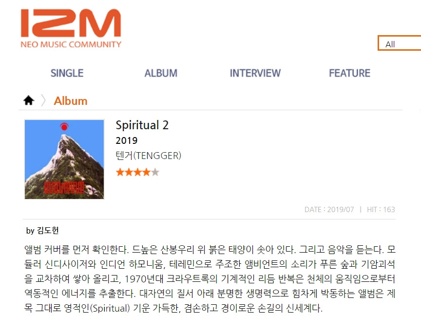 앨범 커버를 먼저 확인한다. 드높은 산봉우리 위 붉은 태양이 솟아 있다. 그리고 음악을 듣는다. 모듈러 신디사이저와 인디언 하모니움, 테레민으로 주조한 앰비언트의 소리가 푸른 숲과 기암괴석을 교차하여 쌓아 올리고, 1970년대 크라우트록의 기계적인 리듬 반복은 천체의 움직임으로부터 역동적인 에너지를 추출한다. 대자연의 질서 아래 분명한 생명력으로 힘차게 박동하는 앨범은 제목 그대로 영적인(Spiritual) 기운 가득한, 겸손하고 경이로운 손길의 신세계다.