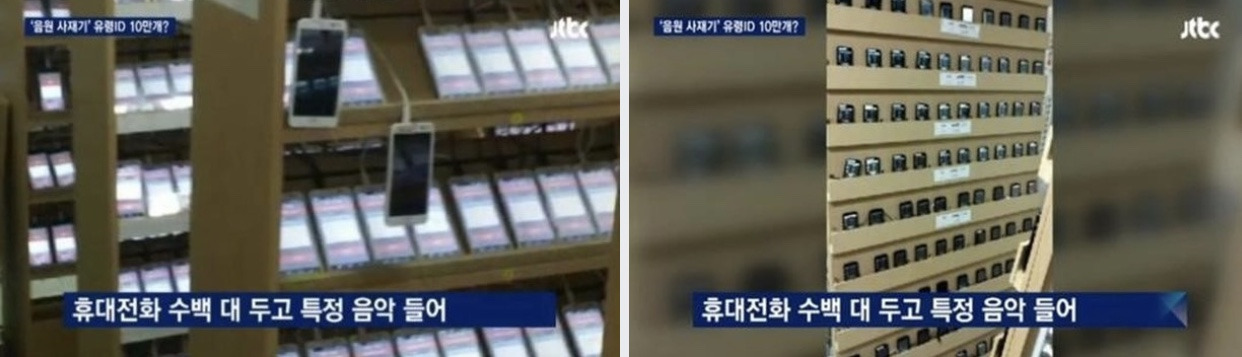 수백, 수천 대의 공기계 휴대폰을 동원하고, 해킹과 유령 계정 등을 통해 다수의 음원 사이트 계정을 확보해 동시다발적으로 특정 곡을 재생해 차트 상위권에 노래를 진입시키는 수법이다.