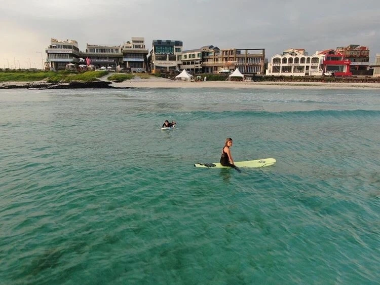 해변에서 서핑을 하는 수많은 서퍼들과, 태닝을 하거나 휴식을 취하며 행복한 물놀이를 즐기는 관광객들.