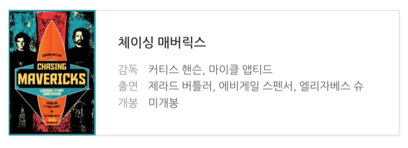 체이싱 매버릭스는 2012년에 개봉한 영화로, 1987년 캘리포니아 산타크루즈에서 8살 소년 제이 모리아리티가 서퍼 프로스티 헤슨에게 구조된 후 서핑에 대한 열정을 갖게 되는 이야기이다. 15세가 된 제이는 프로스티에게 매버릭스 파도를 타는 법을 배우고, 훈련 과정에서 여자친구 킴을 만나며 프로스티의 아내 브렌다의 죽음을 겪는다. 1994년 제이는 매버릭스 서핑에 성공하지만, 22세에 자유 잠수를 하다 사망한다. 영화는 프로스티, 킴 등이 제이를 추모하는 장면으로 마무리된다. 영화는 혹평을 받았으며, 전 세계적으로 790만 달러의 수익을 올렸다.