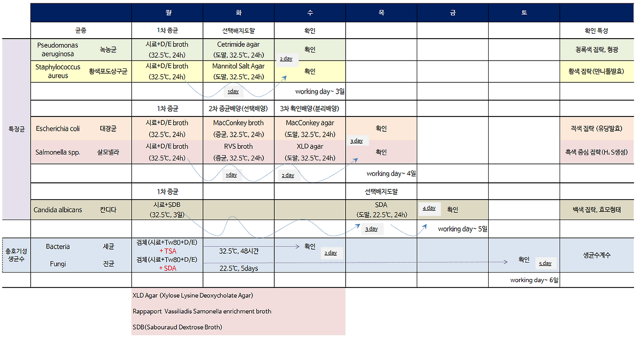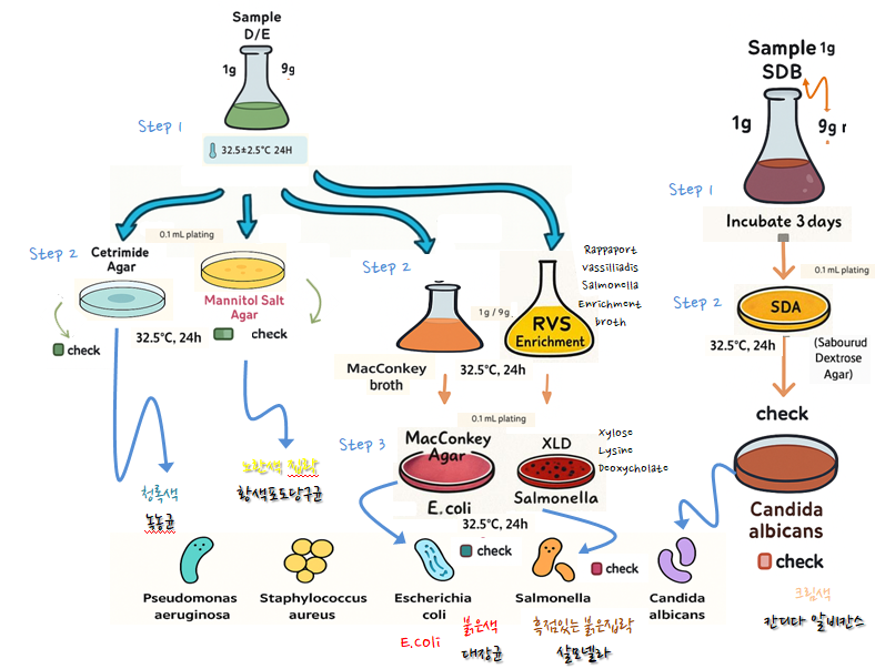 국내화장품기준에서는 녹농균, 황색포도당구균, 대장균이지만 수출할 때 나라마다 요구하는 확인실험이 차이가 나는 경우 있어서 꼭 확인해야 합니다. 그러나 일반적으로 녹농균, 황색포도상구균, 대장균, 살모넬라, 칸디다 5종의 시험범만 숙지하면 된다고 합니다