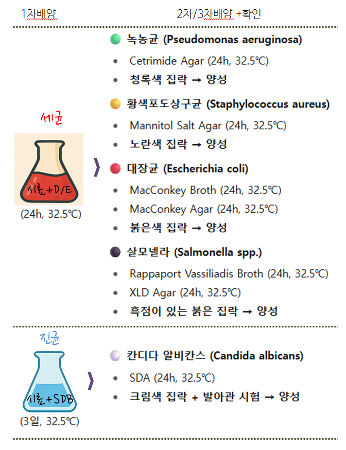 > 배양 과정: 특정균 시험에 사용하는 액체 배지는 해당 특정균(예: 살모넬라)만 선택적으로 잘 자라게 하고, 다른 일반적인 균들의 성장은 억제하는 성분을 포함하고 있습니다. 이 과정을 통해 우리가 찾고자 하는 위험한 특정균만 미리 '선별'하고 '활성화'시키는 효과가 있습니다. 즉 소량의 유해균도 검출 가능하게 만들어 줘야 합니다