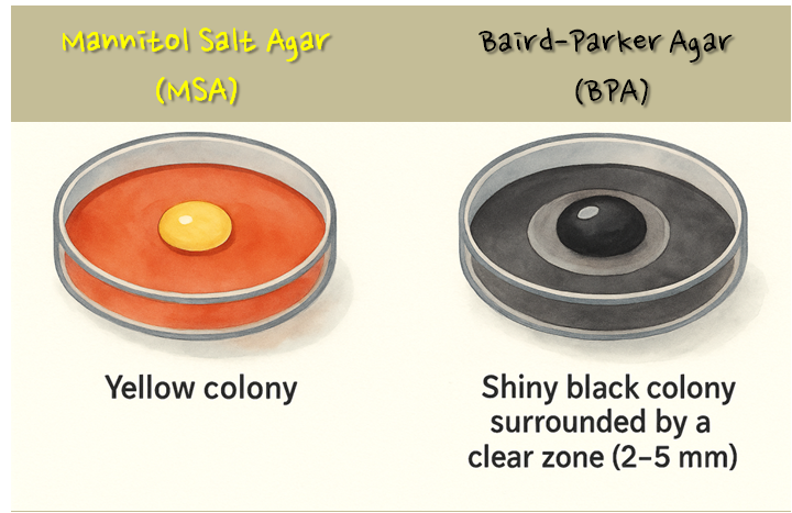 황색포도상구균이 Tellurite를 환원 → 광택 있는 흑색 집락 형성~ 동시에 Lecithinase 활성으로 투명한 halo(2~5mm) 형성→ 검은색 집락+투명대 → 양성