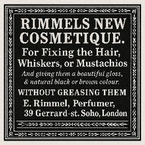 위의 제품이 림멜의 New Cosmetique.입니다. 용도는 남성용으로 머리카락, 구레나룻, 수염에 바르는 일종의 착색제입니다(19세기 중반에는 많은 종류의 남성 수염 착색제가 있었다 합니다).