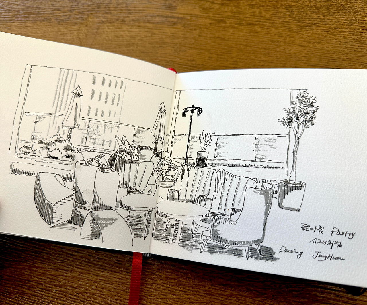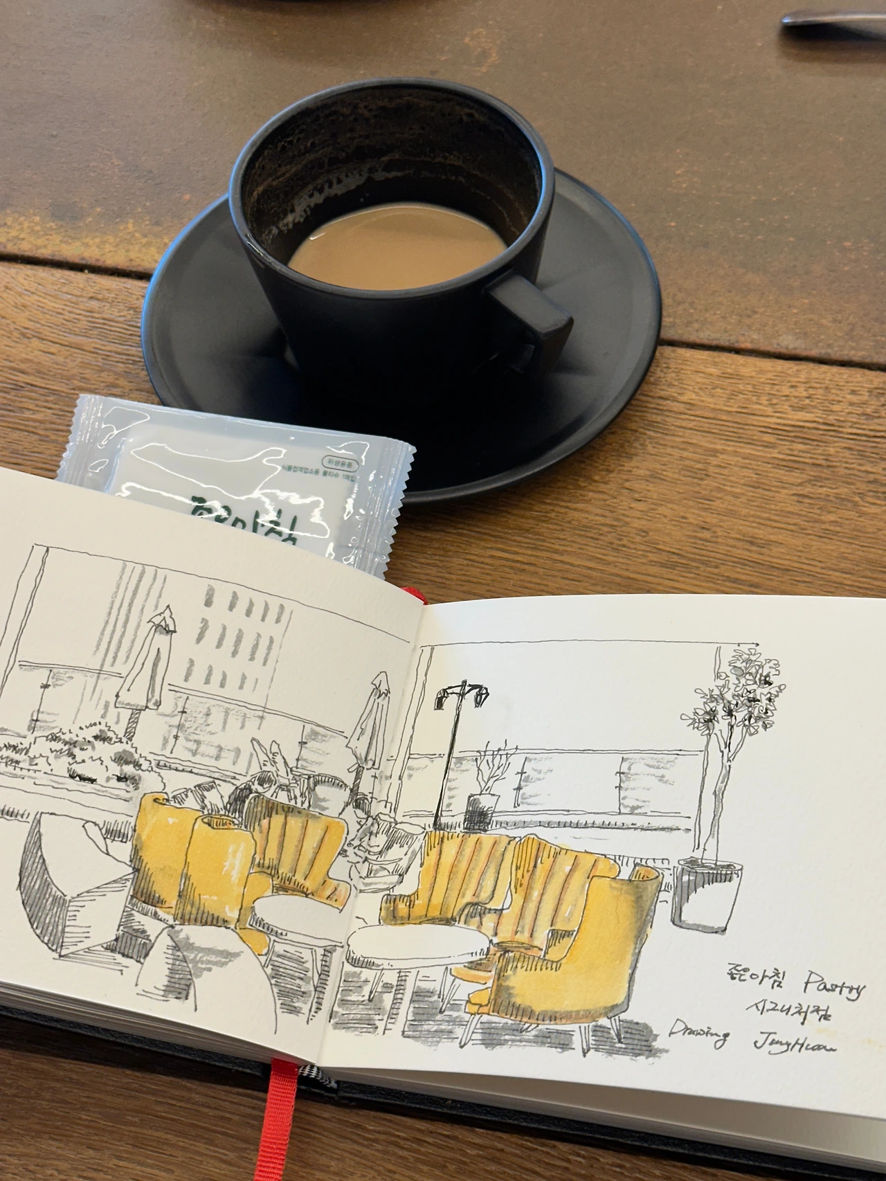 아내는 작은 쇼핑하러 들어가서 나오지를 않는다. 지인과 한참 이야기를 나누었고, 작은 기쁨을 구매한 아내가 이야기를 바통을 이어받았다. 이때다 싶어 펜과 저널 북을 꺼내 들었다. 이제 그림 그릴 시간이다. 이제 내가 그림에 집중하는 것에 대해 주변 사람은 별말이 없다. 그저 나의 일상 중에 하나가 되어버렸다.