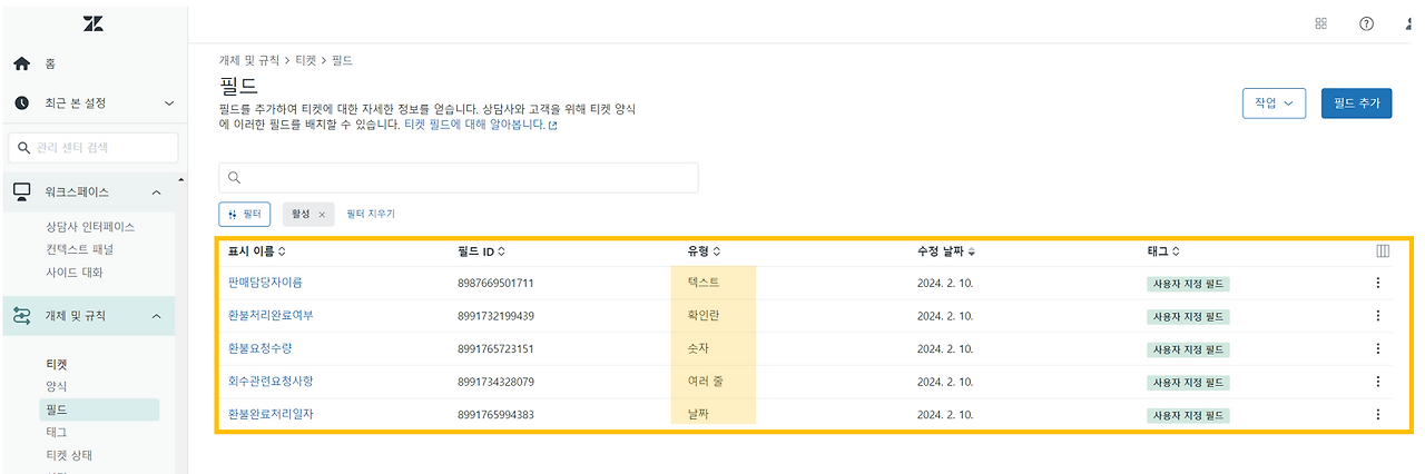 첫 번째로 관리센터에서 필드를 몇 개 추가했습니다.