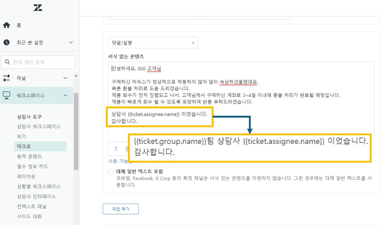 2. {% 와 %}에 포함된 내용은 내부메모나 공개답장에 표시되지 않는다.