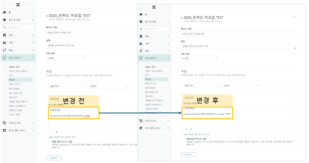 필드에 입력된 값은 소문자이지만, 댓글/설명 란에 입력된 고객 이름은 대문자로 바뀌어서 표기된 것을 알 수 있습니다.
