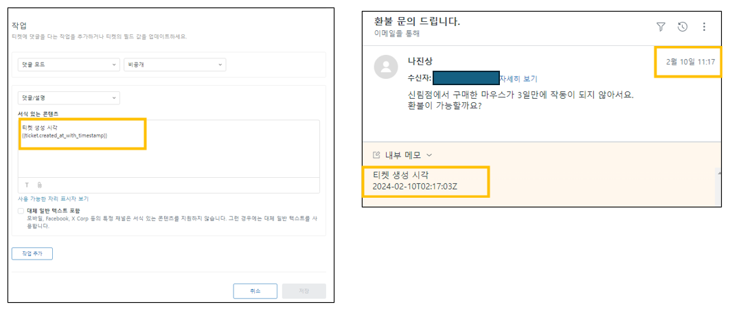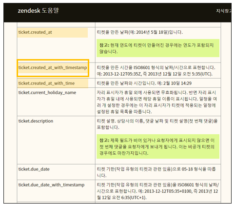 우리는 이 중에서 {{ticket.created_at_with_timestamp}} 를 활용해 보겠습니다.