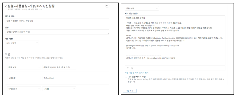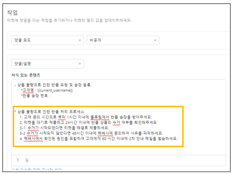 상담사가 이 매크로를 사용하면 젠데스크에서 별도의 양식을 입력하지 않고도 편리하게 반품 송장 번호를 입력할 수 있을 것입니다.