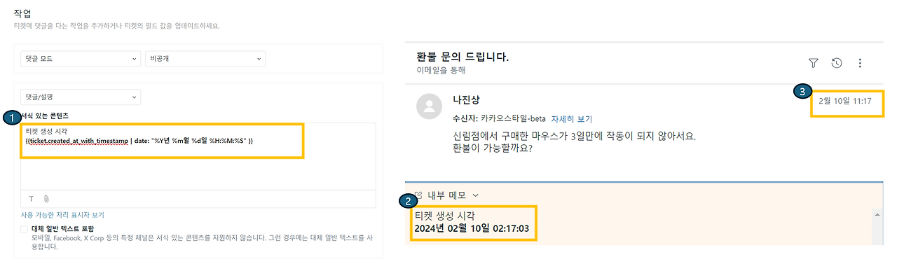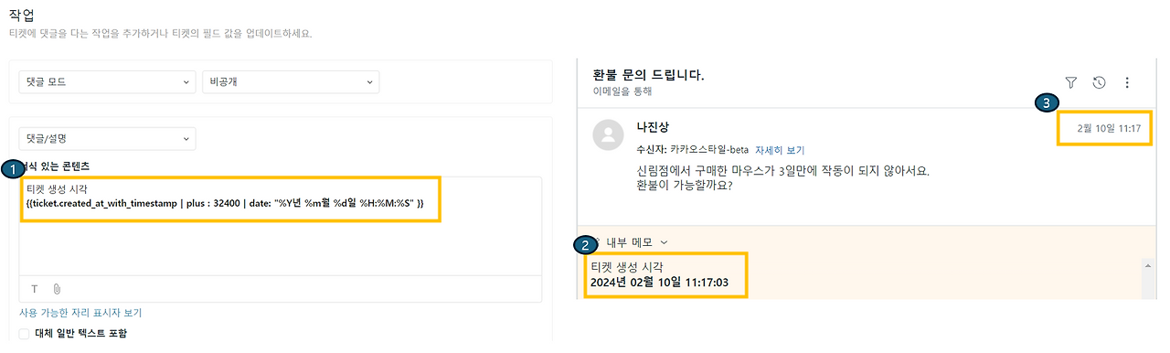 1. 티켓 생성 시각을 가져온다. -> {{ticket.created_at_with_timestamp