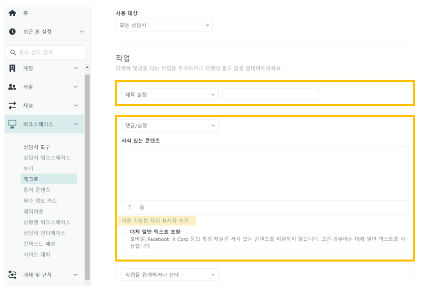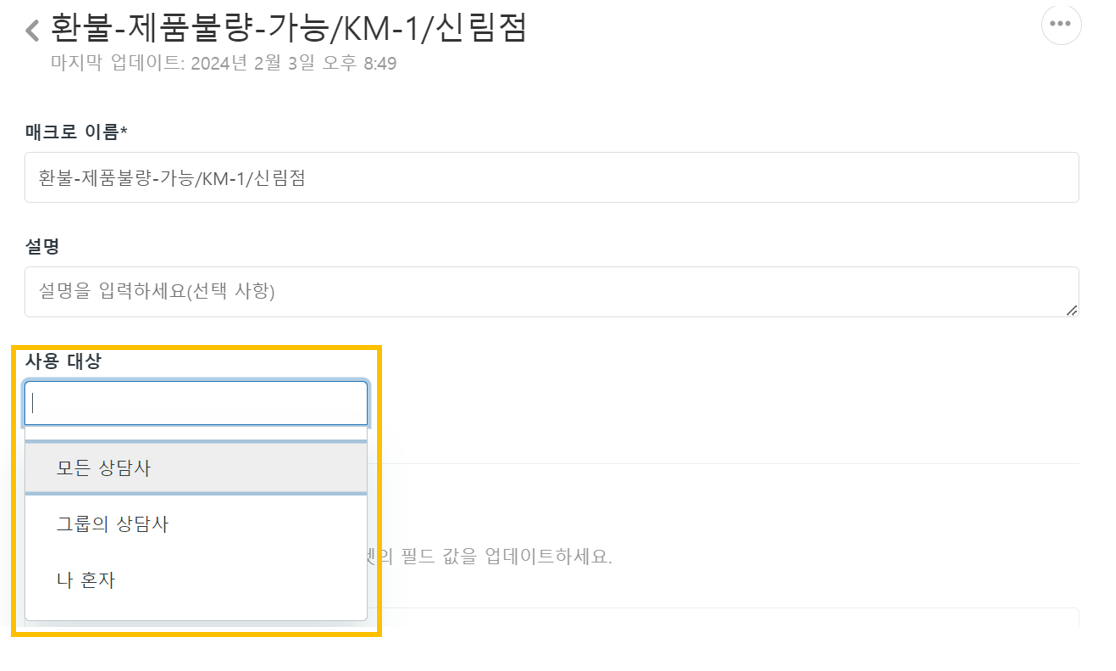 상담사의 경우에는 모든 상담사나 그룹을 위한 매크로를 만드는 것에 제한이 있을 수 있지만, 자신의 위한 매크로를 만드는 것은 얼마든지 가능합니다.