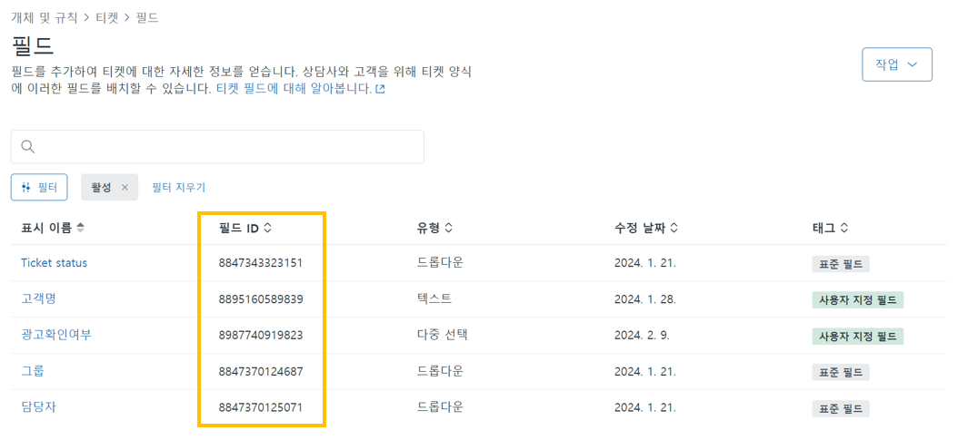 시간이 지나면 생성한 필드가 점차 많아져서 내가 호출하려는 필드가 어디인지 헷갈리는 경우도 생깁니다. 이런 경우에 필드 ID를 빠르게 찾는 방법에 대해서도 차후에 말씀드리겠습니다.