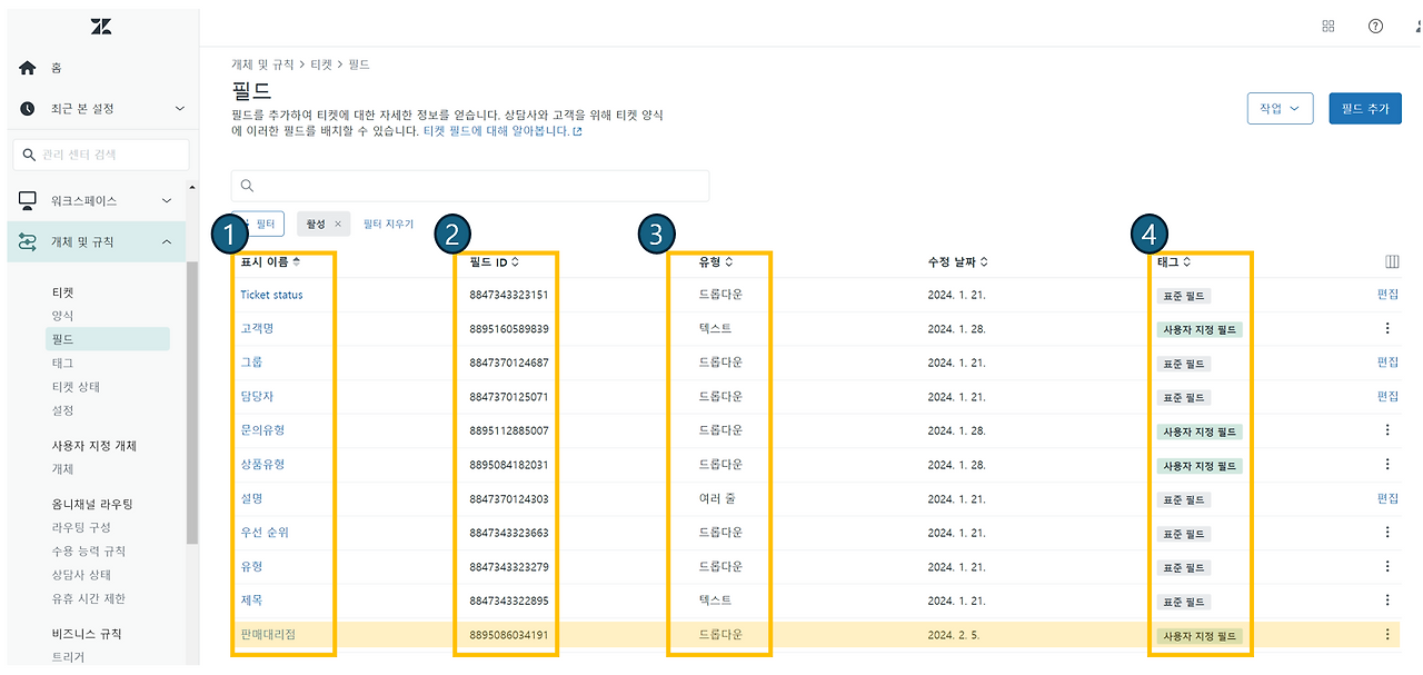 관리센터 > 개체 및 규칙 > 티켓 > 필드 항목으로 이동해 봅시다.