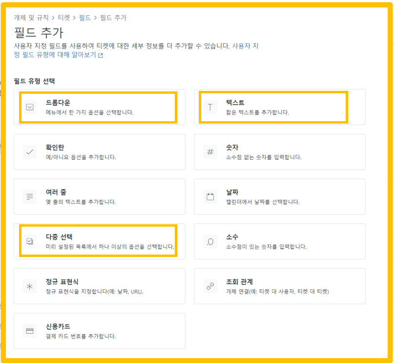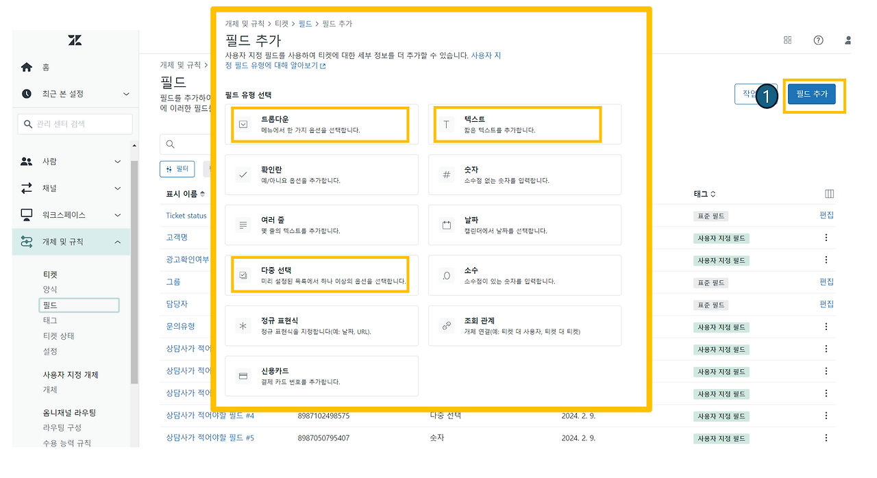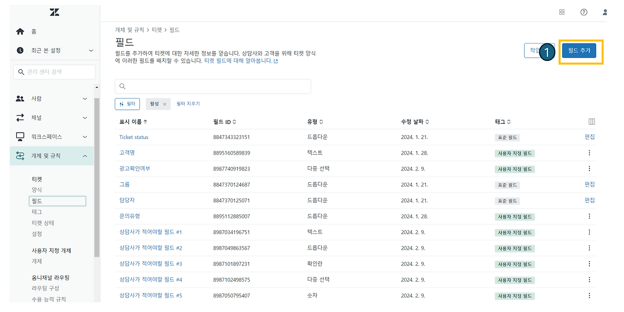 - 관리센터 > 개체 및 규칙 > 티켓 > 필드