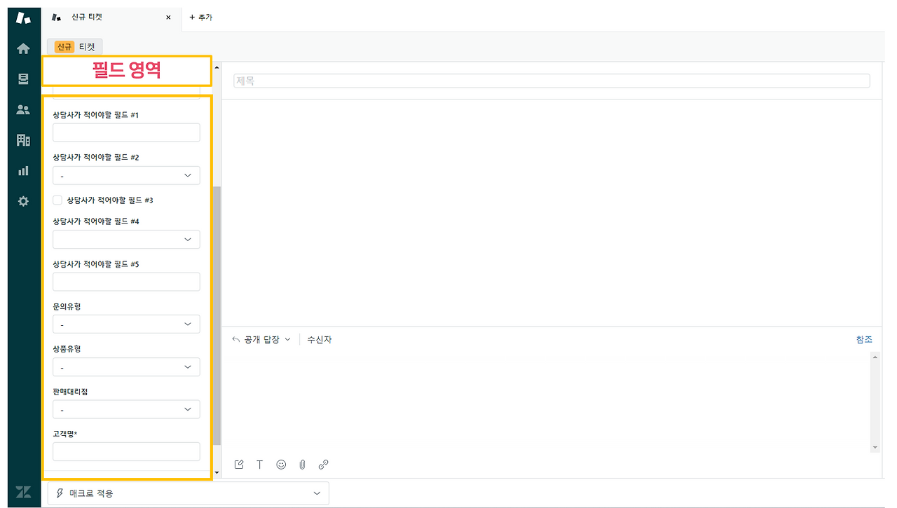 젠데스크 상담 화면에서 왼쪽에 상담사가 입력해야 하는 영역의 이름이 필드 영역입니다.