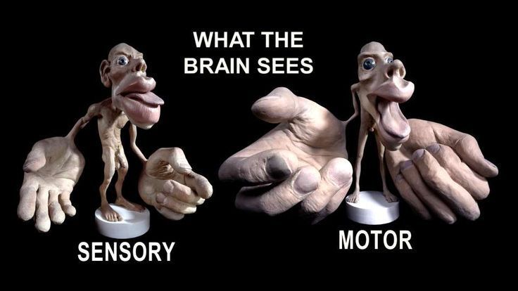 사실 구조적인 이유 때문만이라고 볼 수는 없다. 발도 손과 거의 비슷한 구조를 가지고 있다. 각각 26개씩 양 쪽에 52개의 뼈가 두 발에 들어 있고, 골격의 모양 역시 손과 거의 비슷하다. 관심이 없는 사람들은 발의 뼈를 보고 손이라고 착각할 정도이다. 하지만 손은 발과는 비교도 할 수 없을 만큼 운동 신경과 감각 신경이 발달해있다. 전에 썼던 글, 발 이야기에서도 참고했던 펜필드의 호문쿨루스의 모형을 보면 커다란 두 손이 이쑤시개 같은 팔에 붙어 있는 기형적인 모습을 볼 수 있다. 위 사진에서 처럼 펜필드의 호문쿨루스는 감각 신경을 보여주는 모형과 운동 신경을 보여주는 모형, 이렇게 두 가지 종류가 있다. 운동 모형 쪽에서 더 크기는 해도 운동 모형과 감각 모형 모두에서 손은 몸의 다른 부분들에 비해 압도적으로 크다. 이를 볼 때 우리가 손을 통해 세상을 만나고 손을 통해 세상에 나의 영향력을 발휘한다고 말해도 큰 무리가 없을 것 같다.