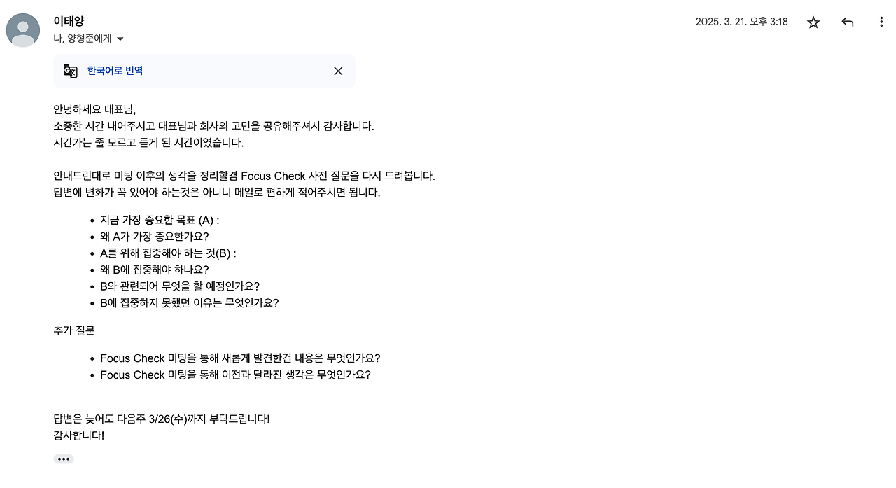 투자 이후 여러 도움이 있었지만, 이런 생각을 완성시켜준건 이태양 대표님과의 Focus Check이었다.