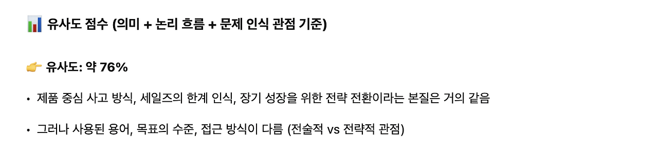 솔직히 똑같다고 느꼈다. 회사의 핵심 내용을 공유할 수는 없으니, GPT한테 유사도 분석을 요구한 내용을 캡쳐로 갈음하면 76%로 용어의 차이 정도만을 이야기하는 놀라운 결과를 확인할 수 있다.