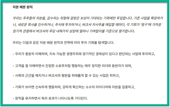 CNBC 등 미국의 주요 언론은 버크셔의 자사주 매입 재개와 에이블의 개인적 주식 매수는 단순한 주가 부양책이 아니라 버크셔와 자신이 주주들과 경제적 운명 공동체라는 사실을 공표하는 의미가 있다고 전했다. 이와 함께 이번 자사주 매입의 재개는 버크셔의 확고한 철학과 자본 배분 원칙이 발현된 결과라고 해석한다. 에이블이 지난달 28일에 주주들에게 공개한 서한의 행간을 보면 이런 철학과 원칙들이 구체적으로 담겨 있는 것을 알 수 있다.