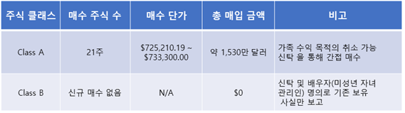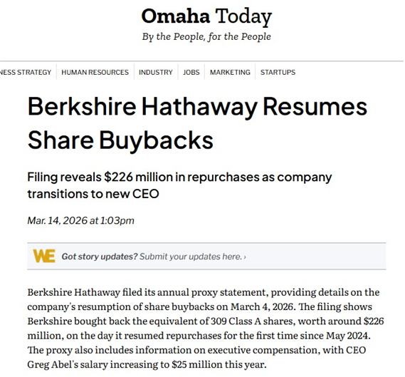 에이블의 개인 차원의 자사주 매입과 별개로 버크셔 해서웨이 법인도 같은 날 2억 달러 이상의 자사주를 매입한 것으로 밝혀졌다. 버크셔의 본사가 있는 오마하의 오마하투데이(Omaha Today)는 지난 3월 14일에 버크셔 해서웨이가 프록시(Proxy) 공시를 통해 3월 4일에 자사주를 매입했다고 보도했다. 주식 종류는 구체적으로 밝히지 않았지만, 클래스 A 주식 309주에 상당하는 2억 2,600만 달러라고 전했다.